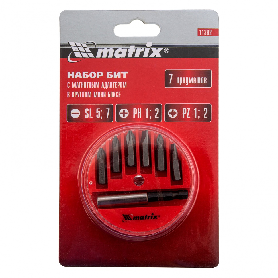 11392 MATRIX Набор бит 1/4" PH,PZ,SL с держателем магнитным 7 предметов в боксе MATRIX