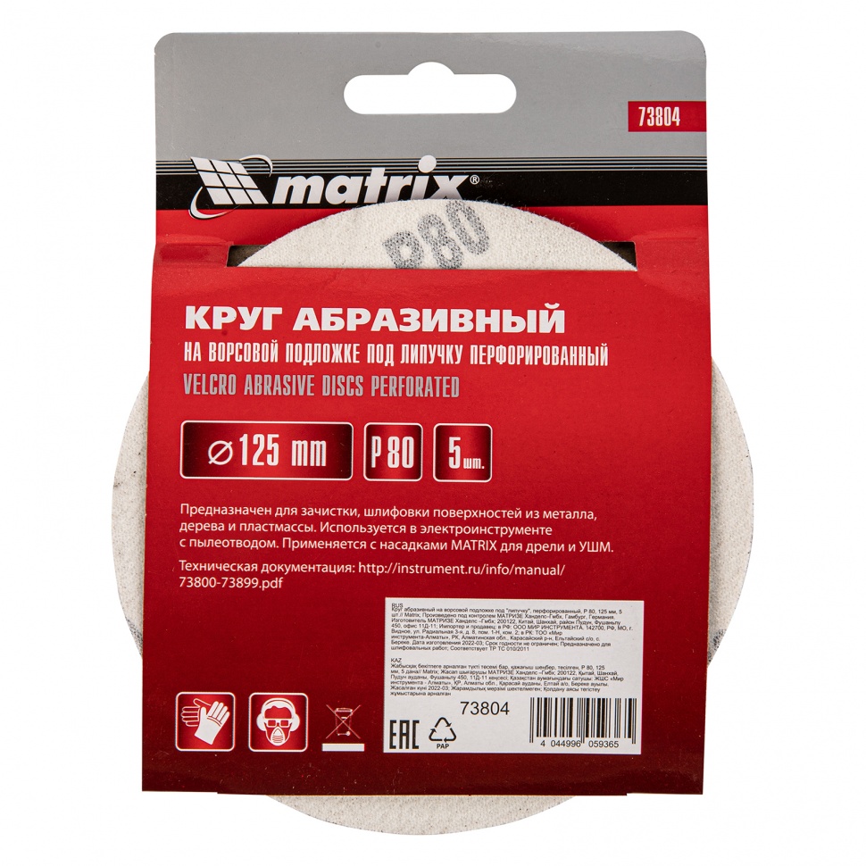 73804 MATRIX Круг шлифовальный на липучке D125 P80 8 отверстий 5шт. MATRIX