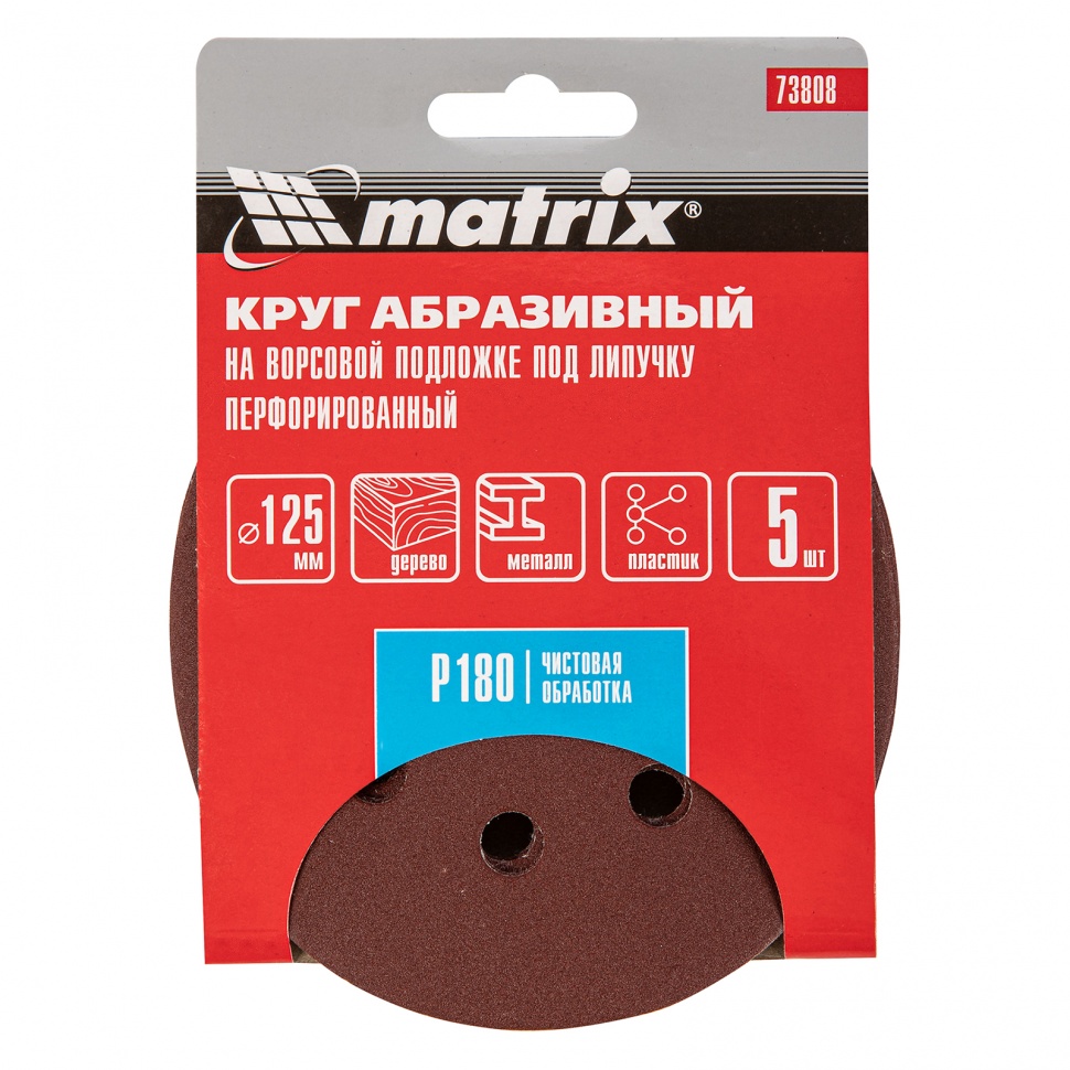 73808 MATRIX Круг шлифовальный на липучке D125 P180 8 отверстий 5шт. MATRIX