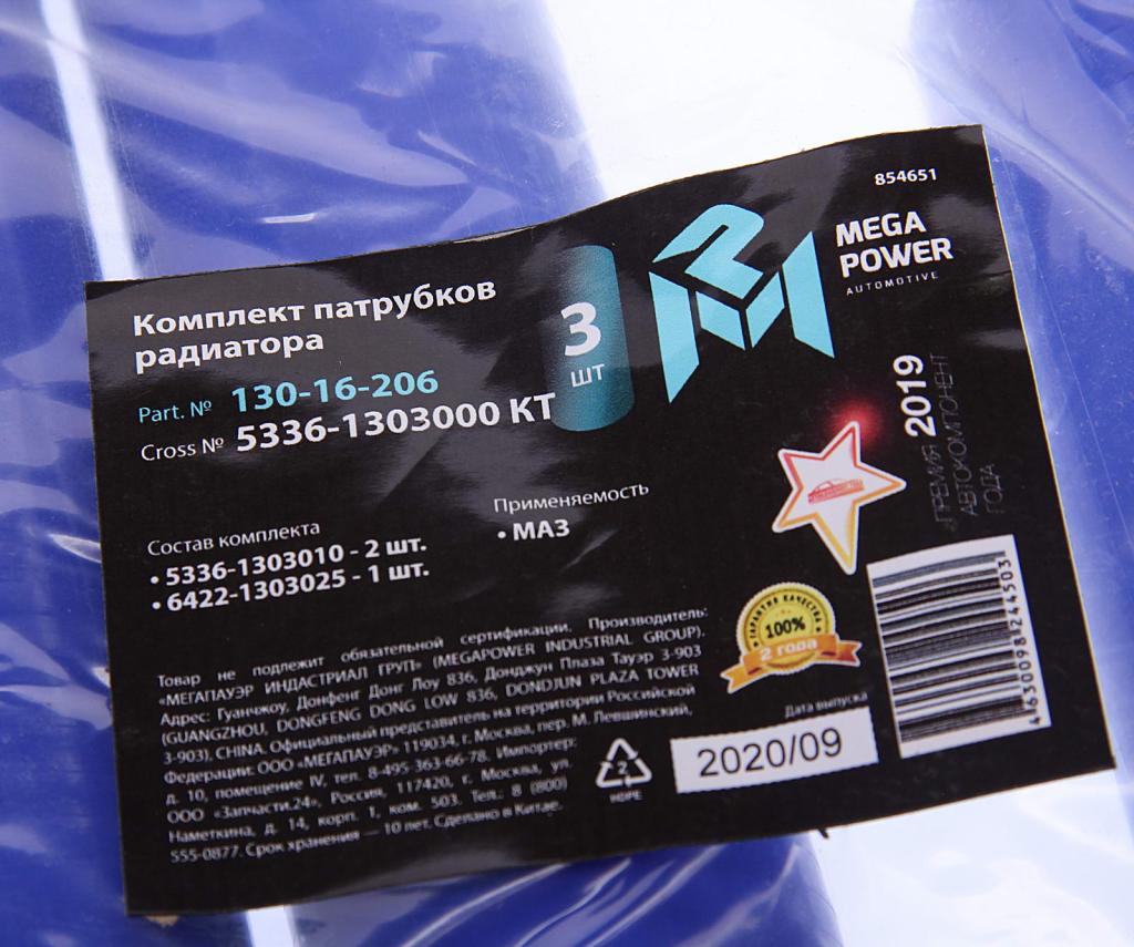| Наименование | 13016206 Патрубок МАЗ радиатора комплект 3шт. синий силикон MEGAPOWER |