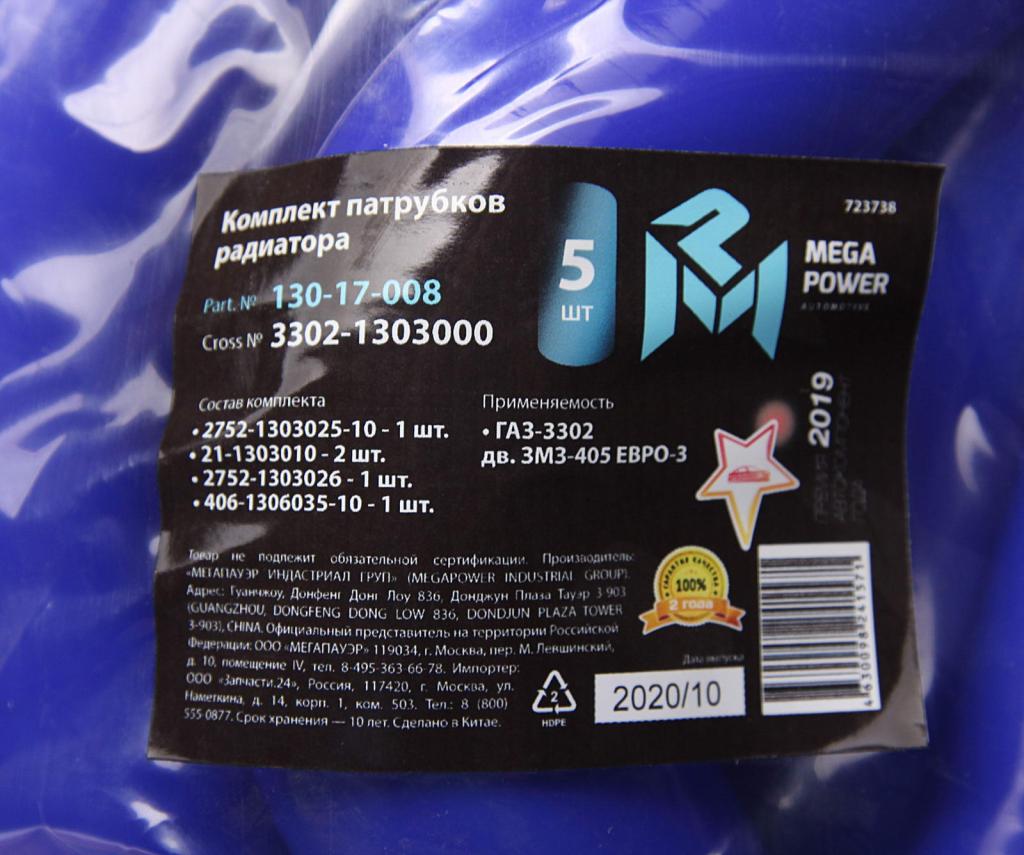 130-17-008 MEGA POWER Патрубок ГАЗ-3302 дв.ЗМЗ-405 ЕВРО-3 радиатора комплект 5шт. синий силикон MEGAPO