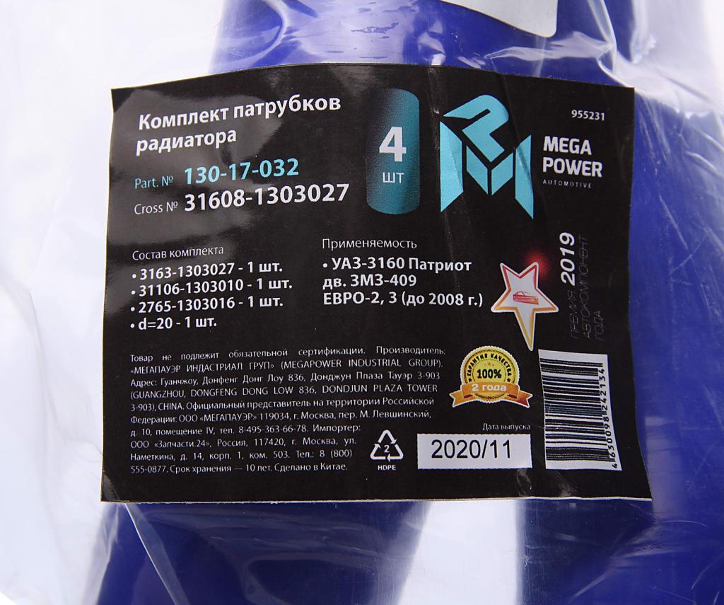 13017032 MEGA POWER Патрубок УАЗ-3160 Патриот дв.ЗМЗ-409 ЕВРО-2,3 (до 2008г.) радиатора комп.4шт.син