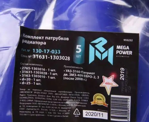 130-17-033 MEGA POWER Патрубок УАЗ-3160 Патриот дв.ЗМЗ-409 ЕВРО-2,3 (после 2008г.)радиатора комп.5шт.с