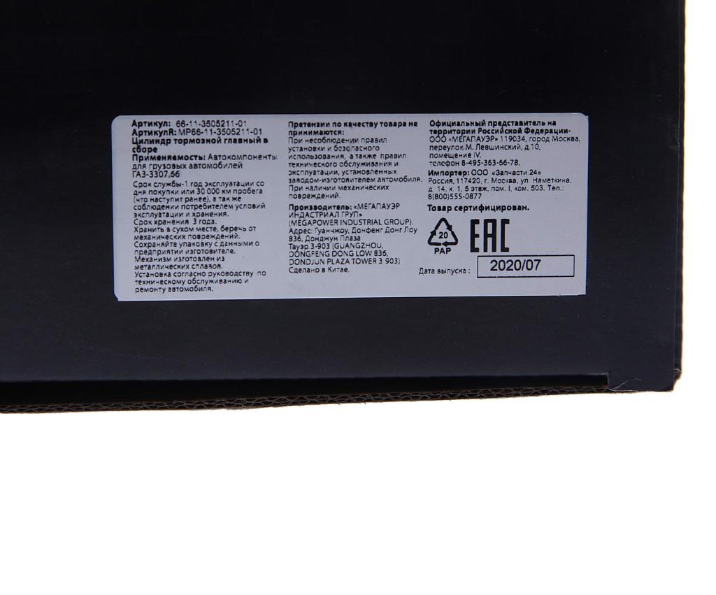 | Наименование | Цилиндр тормозной главный ГАЗ-3307,66 в сборе MEGAPOWER |