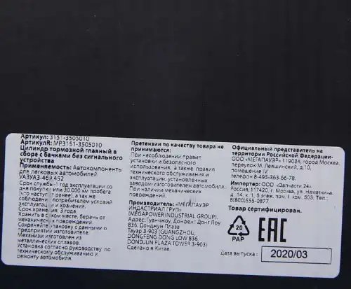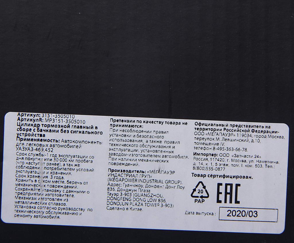 | Наименование | Цилиндр тормозной главный УАЗ в сборе с бачками без сигн. MEGAPOWER |