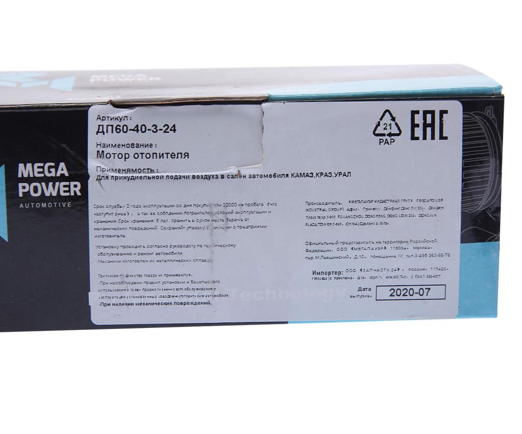 370-15-010 MEGA POWER Мотор отопителя КАМАЗ, КРАЗ, УРАЛ ДП60-40-3-24, МЭ250