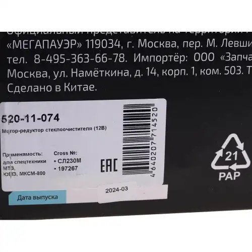| Наименование | Мотор-редуктор стеклоочистителя МТЗ,ЮМЗ,МКСМ-800 12V MEGAPOWER |
