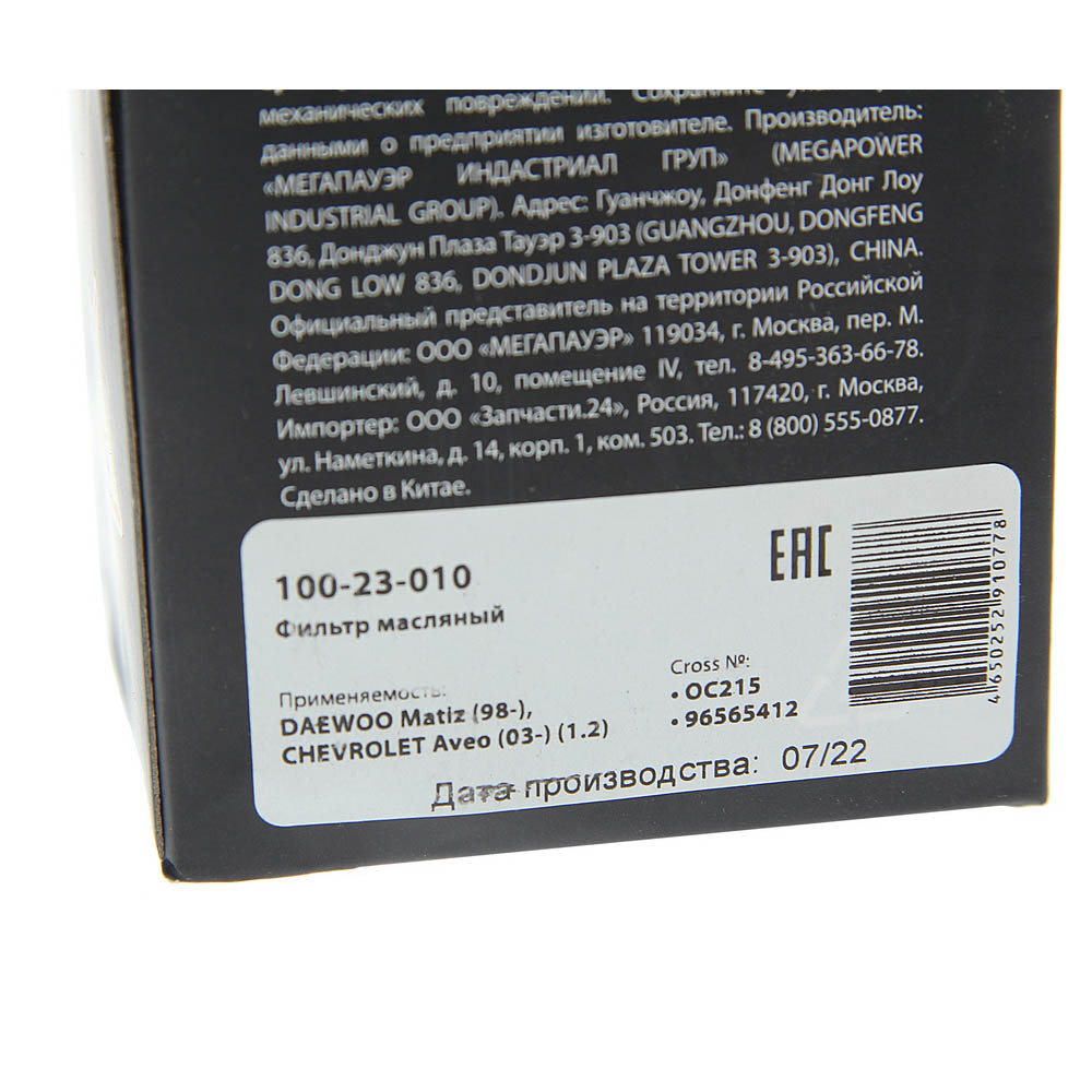 100-23-010 MEGA POWER Фильтр масляный DAEWOO Matiz (98-) CHEVROLET Aveo (03-) (1.2) MEGAPOWER