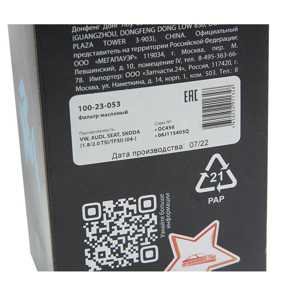 100-23-053 MEGA POWER Фильтр масляный VW AUDI SEAT SKODA (1.8/2.0 TSI/TFSI) (04-) MEGAPOWER