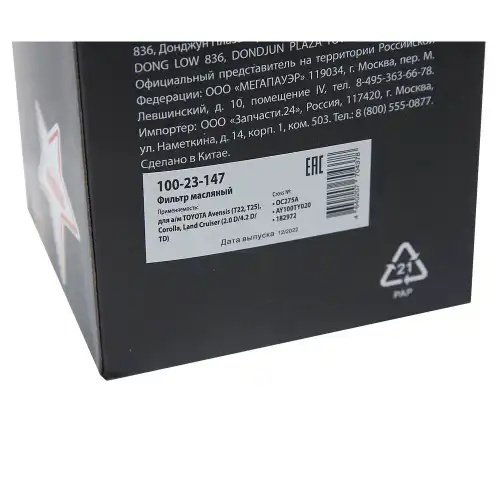 100-23-147 MEGA POWER Фильтр масляный TOYOTA Avensis (T22,T25),Corolla,Land Cruiser (2.0 D/4.2 D/TD) M