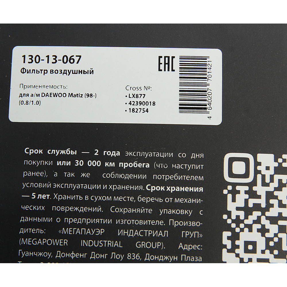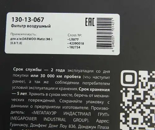 | Наименование | Фильтр воздушный DAEWOO Matiz (98-) (0.8/1.0) MEGAPOWER |