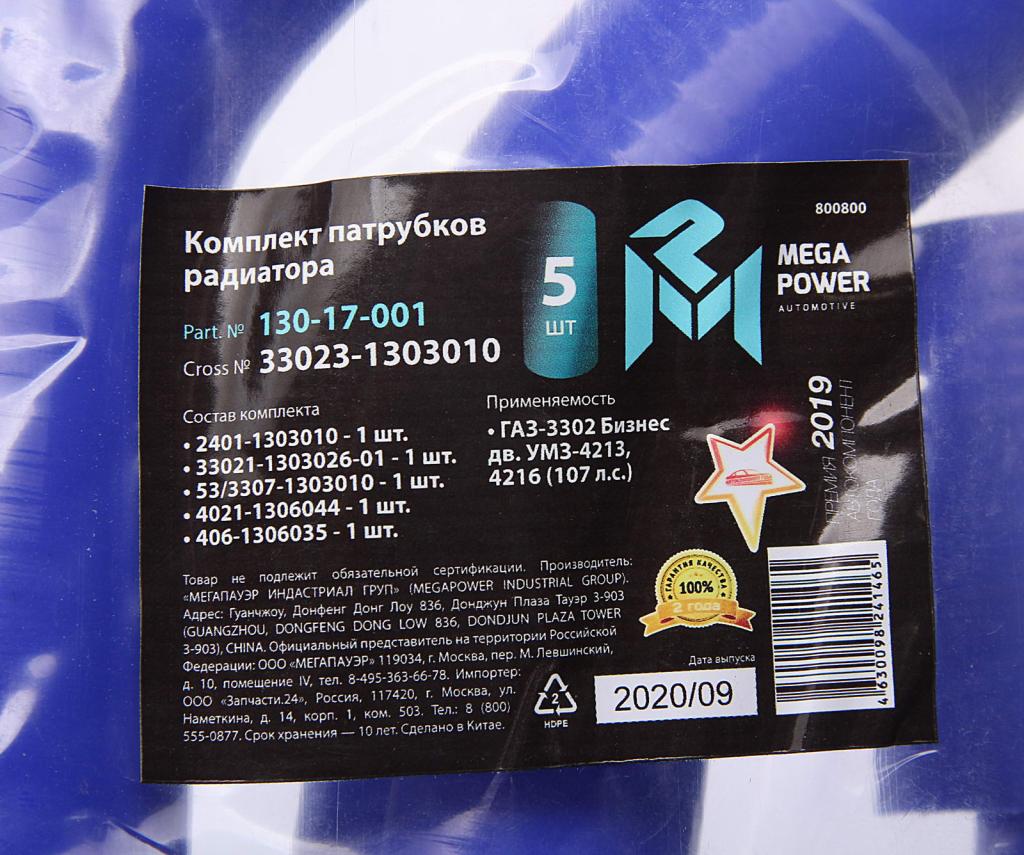 130-17-001 MEGA POWER Патрубок ГАЗ-3302 Бизнес дв.УМЗ-4213,4216 (107 л.с) радиатора комплект 5шт. сини