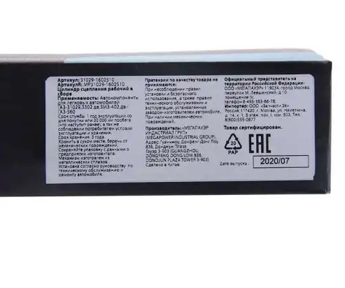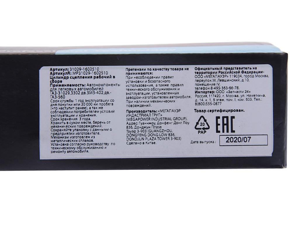 | Наименование | Цилиндр сцепления рабочий ГАЗ-31029,3302 дв.ЗМЗ-402,ГАЗ-560 в сборе MEGAPOWER |