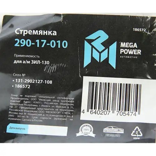 | Наименование | Стремянка ЗИЛ-130 ушка рессоры передней L=108мм;М16х1.5мм усиленная MEGAPOWER |