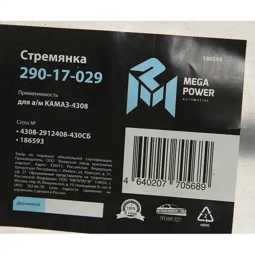 | Наименование | Стремянка КАМАЗ-4308 рессоры задней L=430мм;М20х1.5мм усиленная в сборе MEGAPOWE |