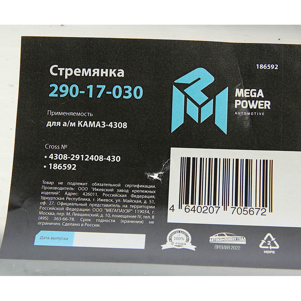 | Наименование | Стремянка КАМАЗ-4308 рессоры задней L=430мм;М20х1.5мм усиленная MEGAPOWER |