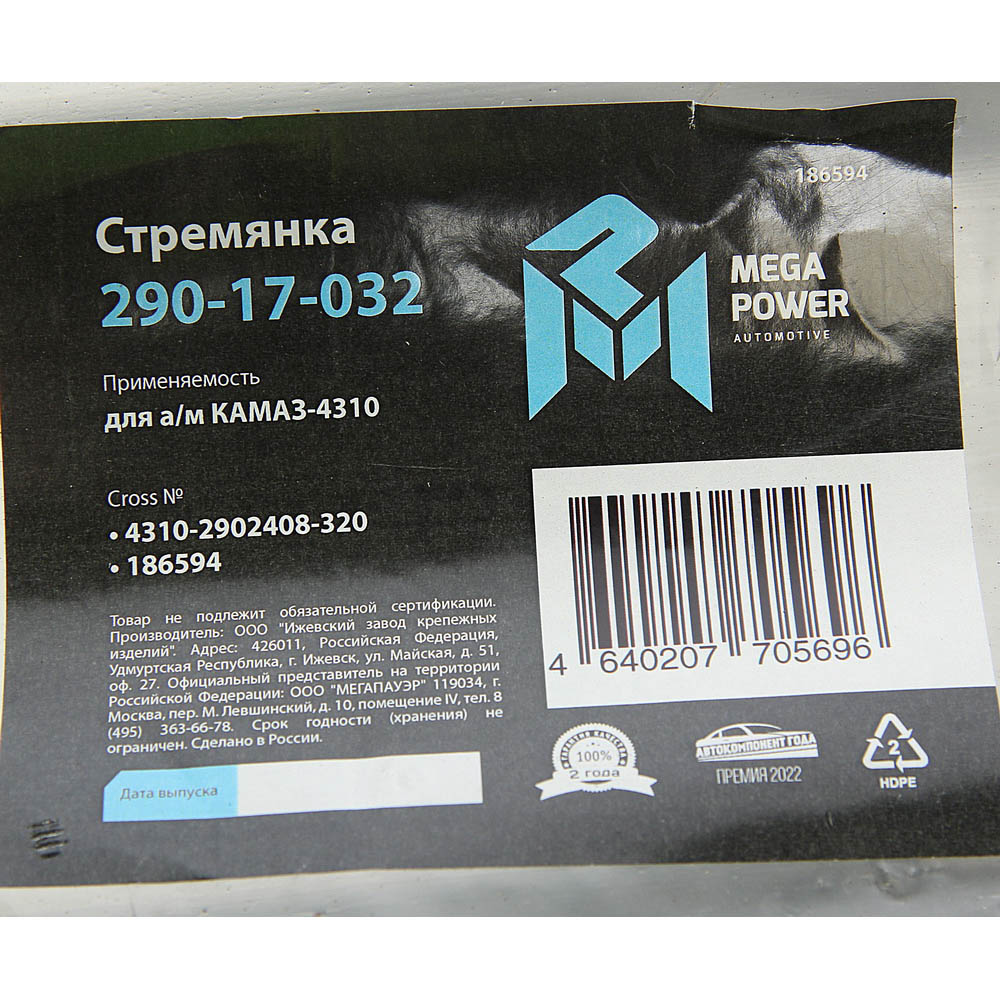 | Наименование | Стремянка КАМАЗ-4310 рессоры передней L=320мм;М20х1.5мм усиленная MEGAPOWER |