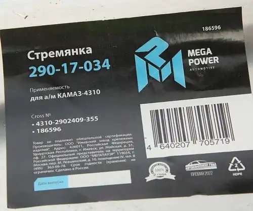 | Наименование | Стремянка КАМАЗ-4310 рессоры передней L=355мм;М20х1.5мм усиленная MEGAPOWER |