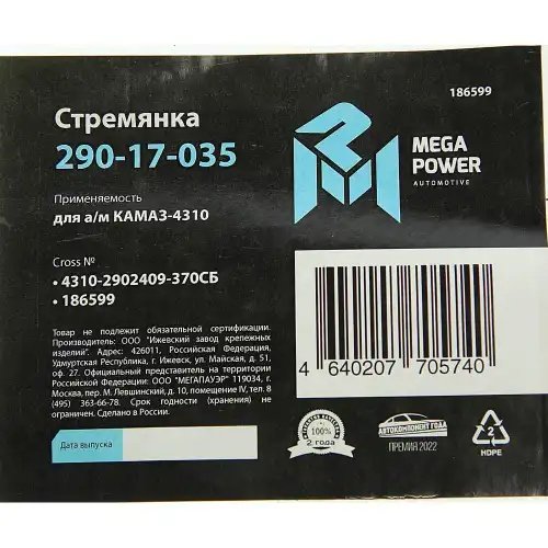 | Наименование | Стремянка КАМАЗ-4310 рессоры передней L=370мм;М20х1.5мм усиленная в сборе MEGAPO |