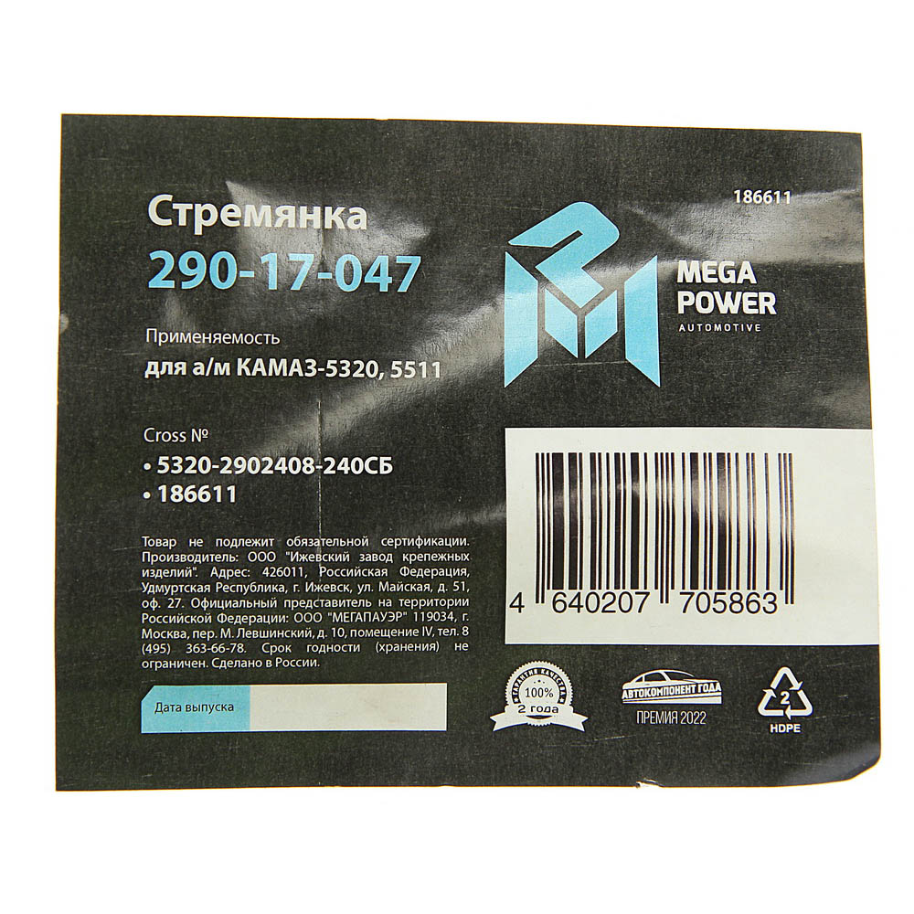 29017047 MEGA POWER Стремянка КАМАЗ-5320,5511 рессоры передней L=240мм;М20х1.5мм кованая в сборе MEG