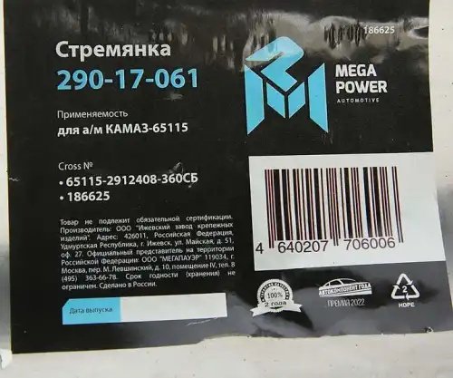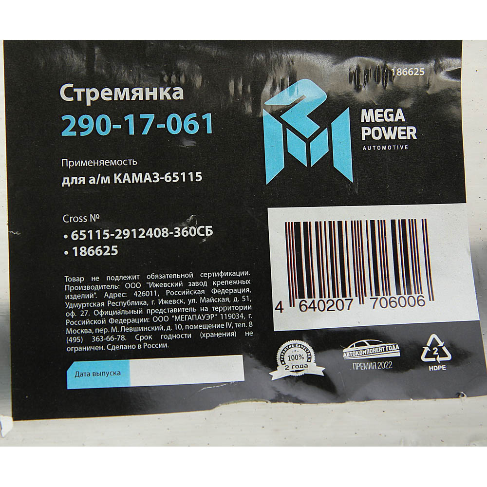 | Наименование | Стремянка КАМАЗ-65115 рессоры задней L=360мм;М27х2мм усиленная в сборе MEGAPOWER |