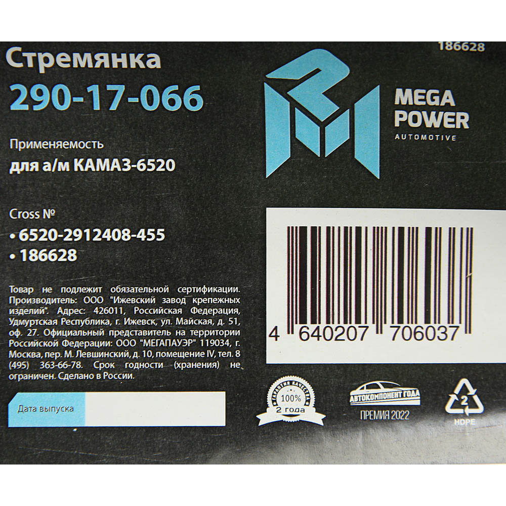 | Наименование | Стремянка КАМАЗ-6520 рессоры задней (20 тонн) L=455мм;М30х2мм кованая MEGAPOWER |