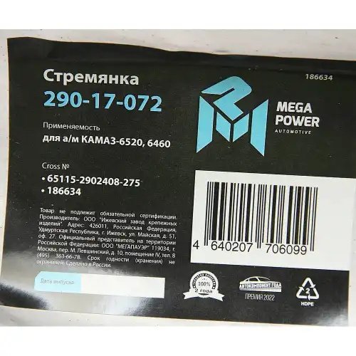 | Наименование | Стремянка КАМАЗ-6520,6460 рессоры передней L=275мм;М24х2мм усиленная MEGAPOWER |