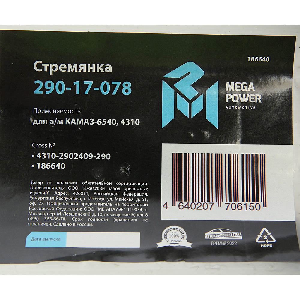 | Наименование | Стремянка КАМАЗ-6540,4310 рессоры передней L=290мм;М20х1.5мм усиленная MEGAPOWER |