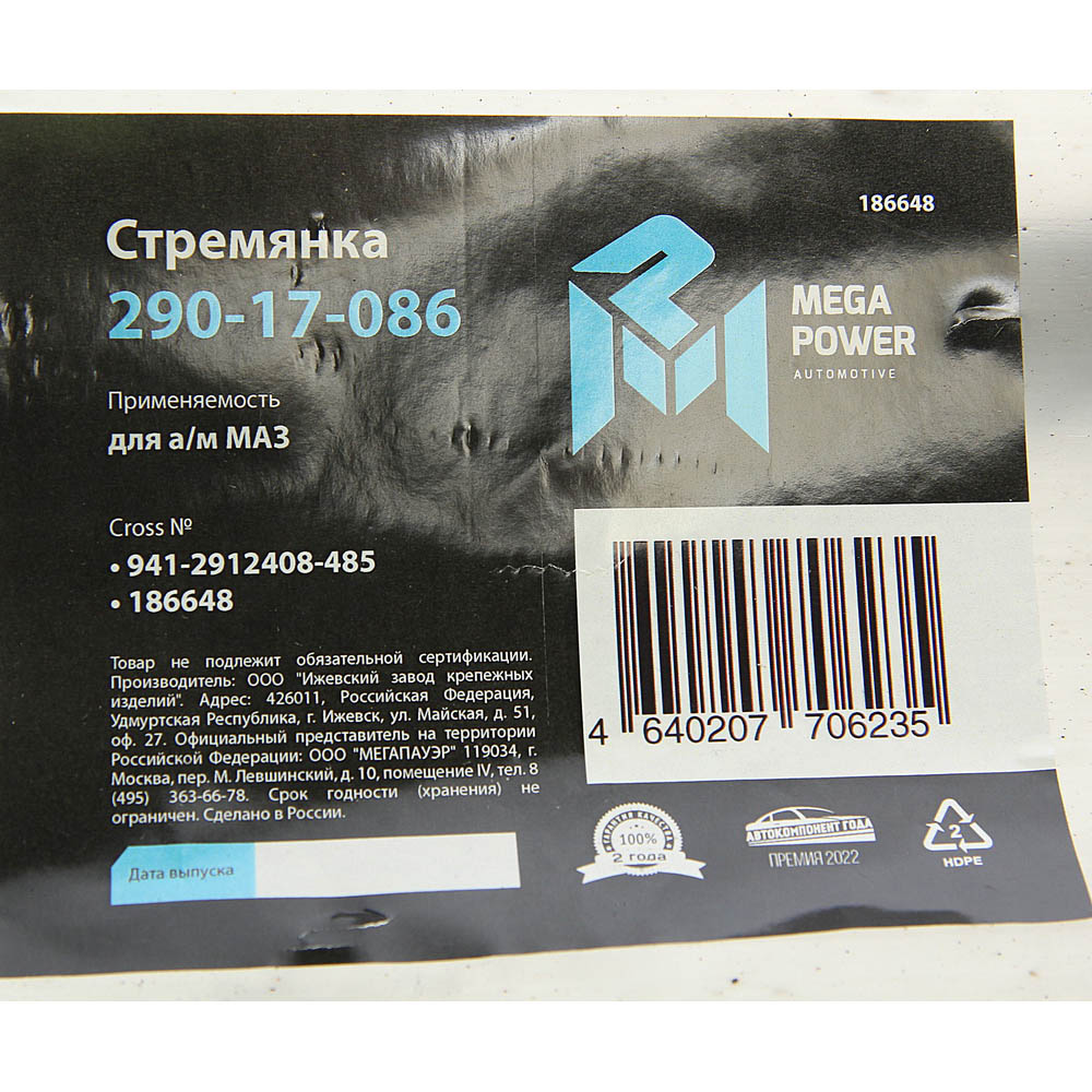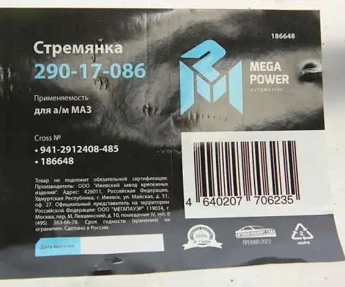 | Наименование | Стремянка МАЗ полуприцепа рессоры задней L=485мм;М27х2мм кованая MEGAPOWER |