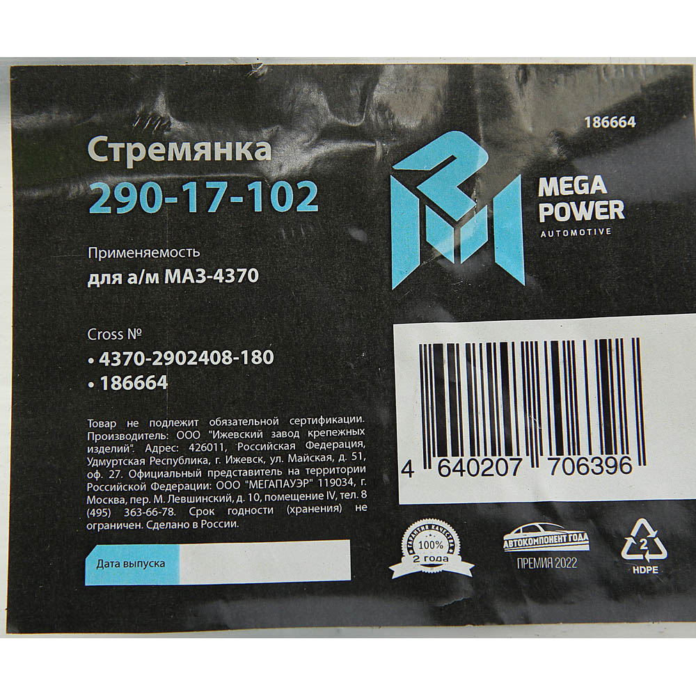 29017102 MEGA POWER Стремянка МАЗ-4370 рессоры передней L=180мм;М14х1.5мм длинная усиленная MEGAPOWE