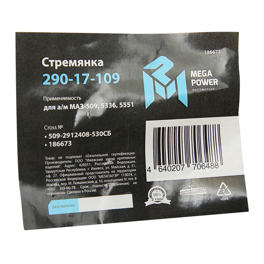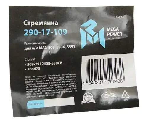 | Наименование | Стремянка МАЗ-509,5336,5551 рессоры задней L=530мм;М27х2мм кованая в сборе MEGAP |