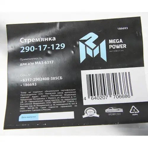 | Наименование | Стремянка МАЗ-6317 рессоры передней L=385мм;М24х2мм усиленная в сборе MEGAPOWER |