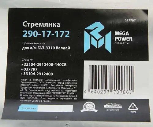 29017172 MEGA POWER Стремянка ГАЗ-3310 Валдай рессоры задней L=440мм;М20х1.5мм усиленная в сборе MEG