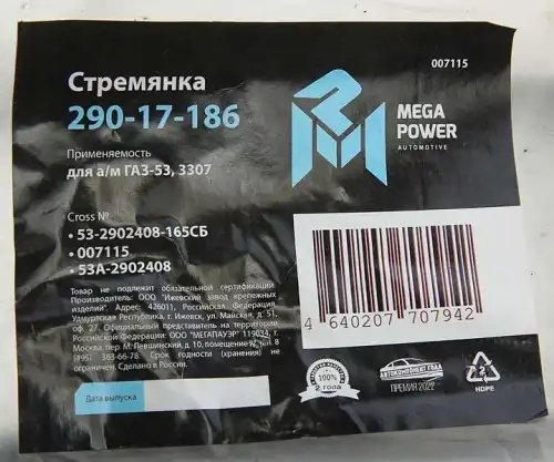 | Наименование | Стремянка ГАЗ-53,3307 рессоры передней L=165мм;М16х1.5мм кованая в сборе MEGAPOW |