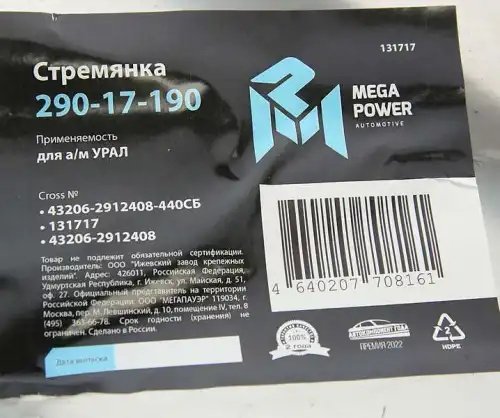 | Наименование | Стремянка УРАЛ рессоры задней L=440мм;М27х2мм усиленная в сборе MEGAPOWER |