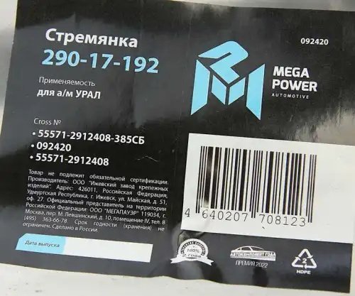 | Наименование | Стремянка УРАЛ рессоры задней L=385мм;М27х2мм усиленная в сборе MEGAPOWER |