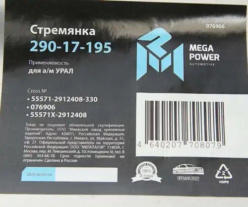 | Наименование | Стремянка УРАЛ рессоры задней L=330мм;М27х2мм усиленная MEGAPOWER |