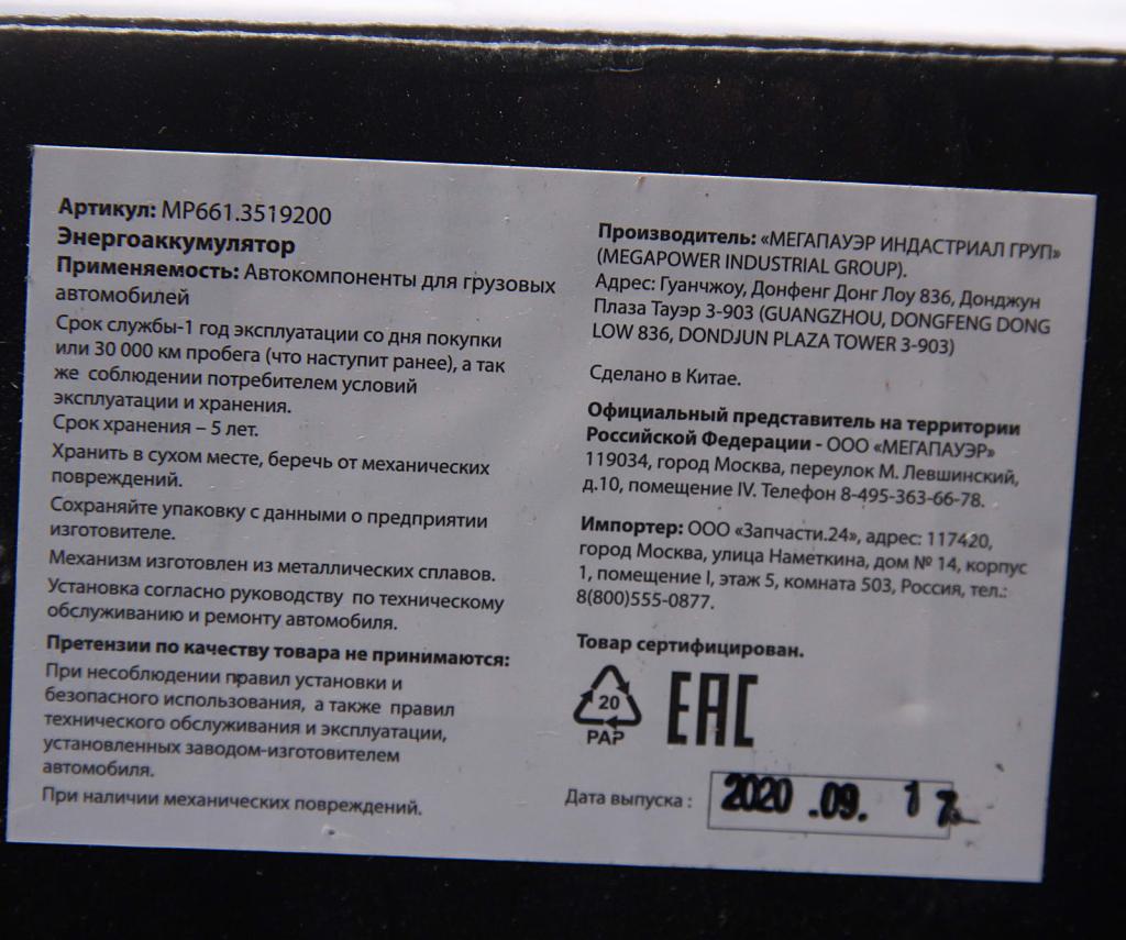 | Наименование | Энергоаккумулятор ЗИЛ,МАЗ,КАМАЗ,КРАЗ 24/20 MEGAPOWER |