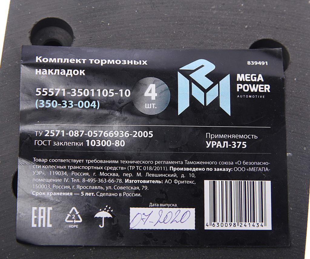35033004 MEGA POWER Накладка тормозной колодки УРАЛ сверленая расточен. комплект 4шт. с заклепками M