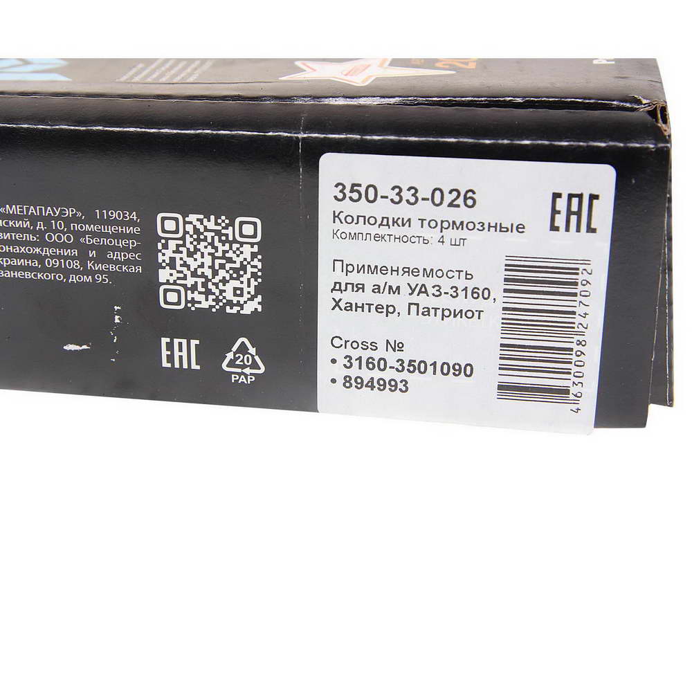 350-33-026 MEGA POWER Колодки тормозные УАЗ-3160,Хантер,Патриот передние (4шт.) MEGAPOWER