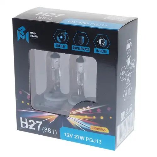 | Наименование | Лампа 12V H27(881) 27W PGJ13 бокс (2шт.) Long Life MEGAPOWER |