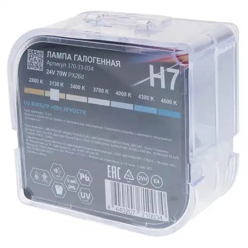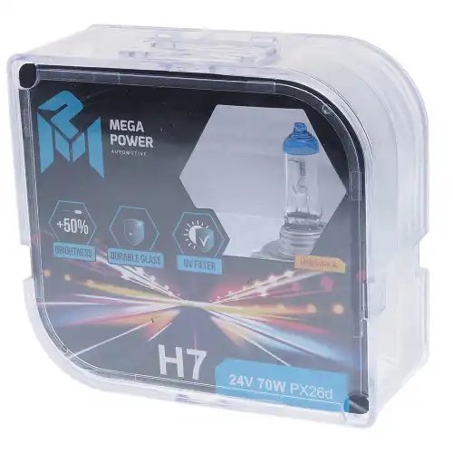 | Наименование | Лампа 24V H7 70W PX26d +50% бокс (2шт.) MEGAPOWER |