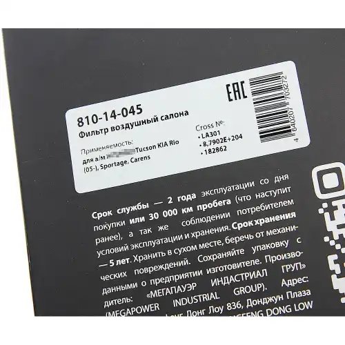 | Наименование | Фильтр воздушный салона HYUNDAI Tucson KIA Rio (05-),Sportage,Carens MEGAPOWER |