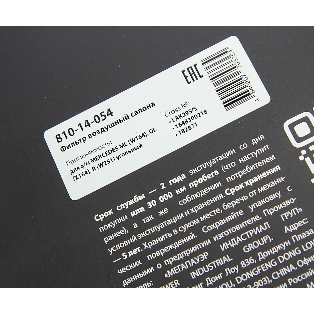 | Наименование | Фильтр воздушный салона MERCEDES ML (W164),GL (X164),R (W251) угольный MEGAPOWER |