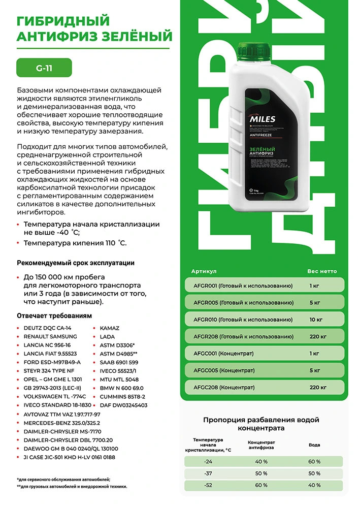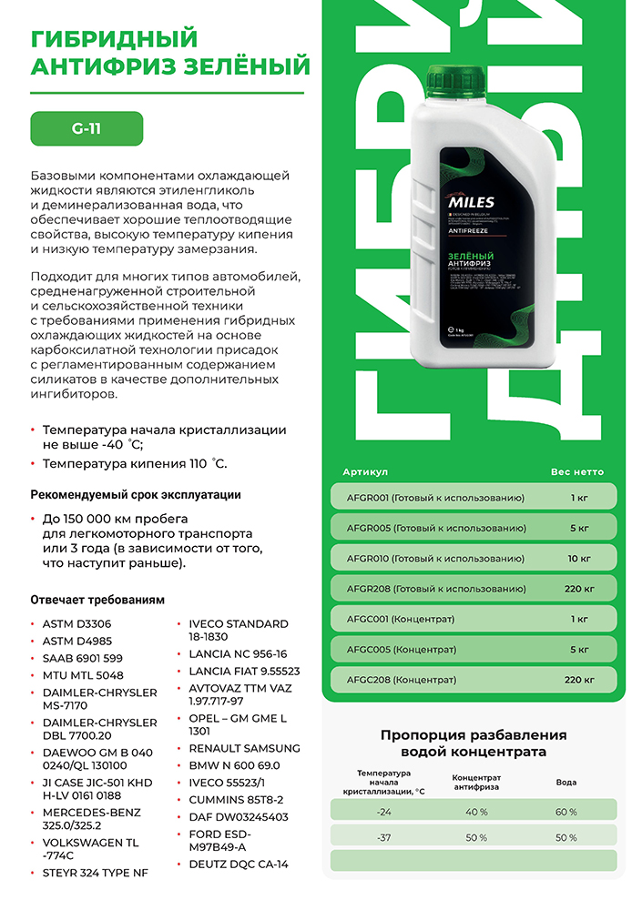 AFGC001 MILES Антифриз концентрат G11 (зеленый, SUPER LONG LIFE COOLANT) 1кг AFGC001