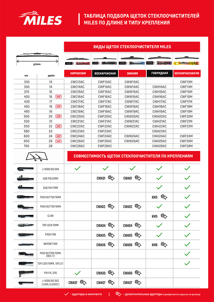 CWH15BC MILES Щетка стеклоочистителя 375 мм (15) гибридная (10 адаптеров) CWH15BC