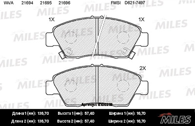 E100219 MILES Колодки тормозные передние (без датчика) (Смесь Semi-Metallic) HONDA CIVIC 91-05