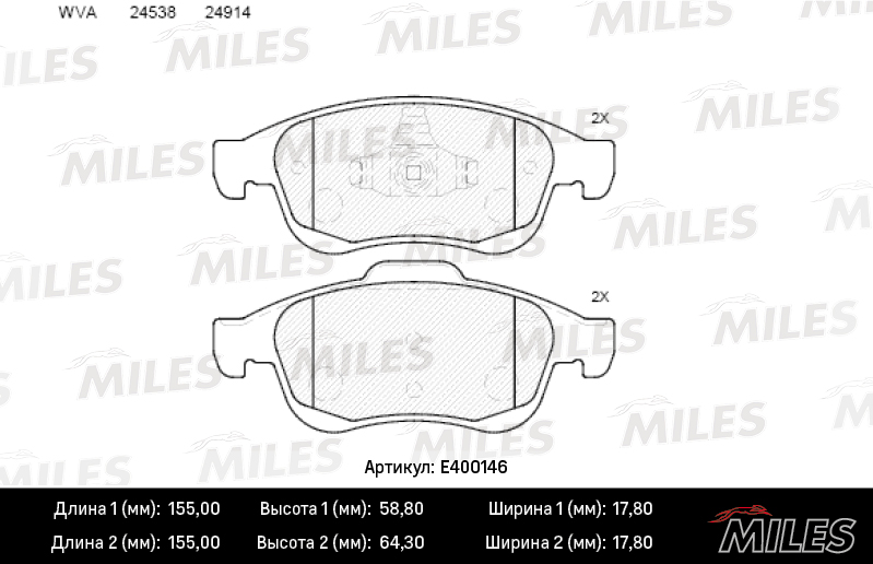 E400146 MILES Колодки тормозные передние (без датчика) (Смесь Low-Metallic) (RENAULT DUSTER с
