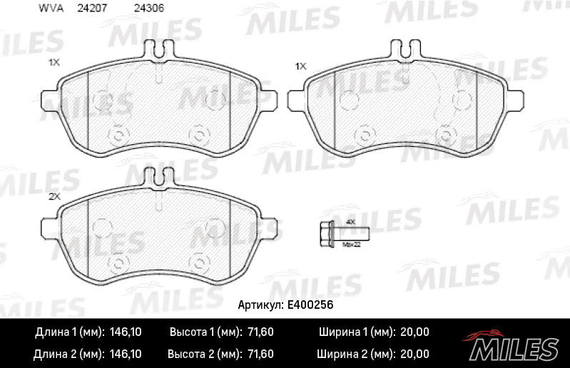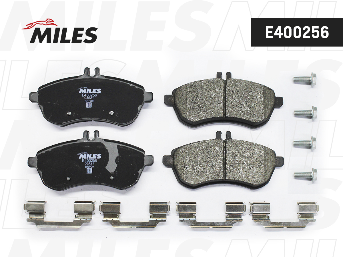 E400256 MILES Колодки тормозные передние (без датчика + болты) (Смесь Low-Metallic) (MB W204/W