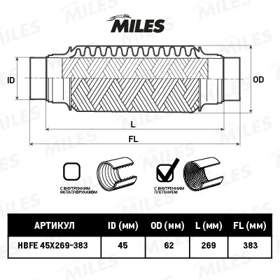 HBFE45X269-383 MILES Труба гофрированная (гофра) патрубками и внутренним плетением 45X269-383 (BOSAL